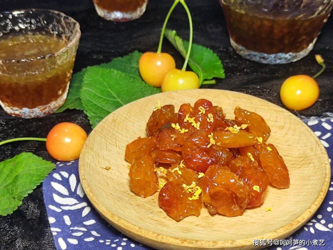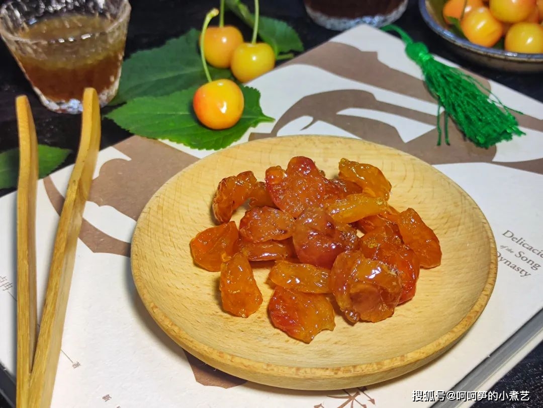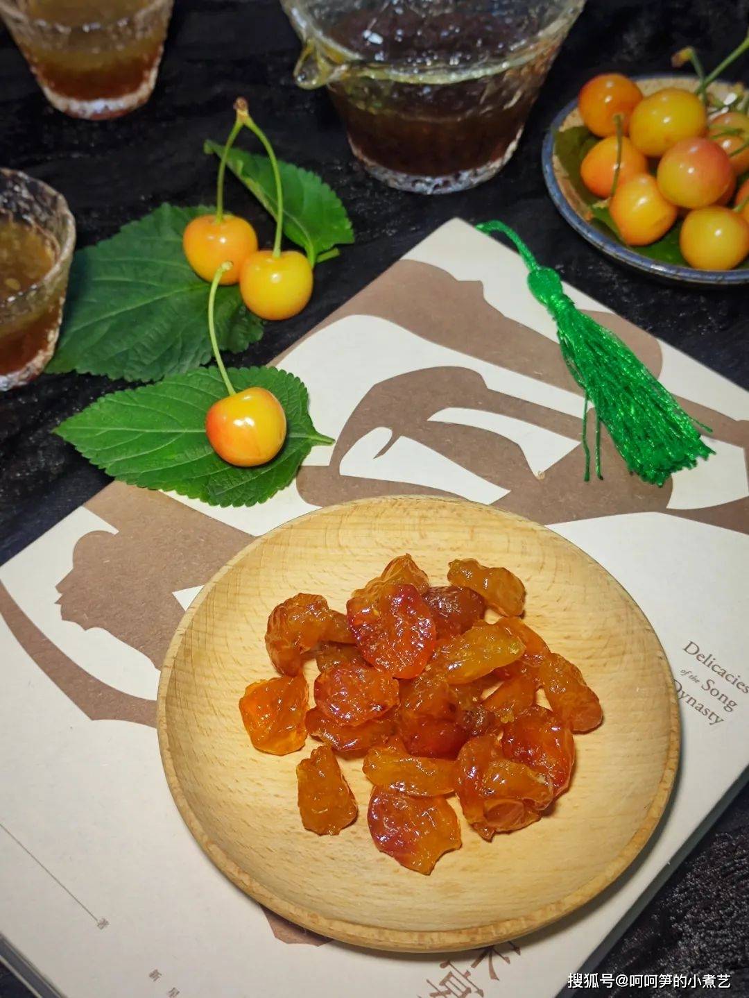 其实在《宋宴》这本书里也有『蜜煎樱桃』,樱桃去核加糖,加热至糖融化,煮至樱桃析出较多水分,捞出控干汁液。再次入锅,加糖和蜂蜜煎制20分钟,再次捞出控干水分,再加蜜煎制,重复2-3次煎至樱桃水分收干,密封保存或晒干。
