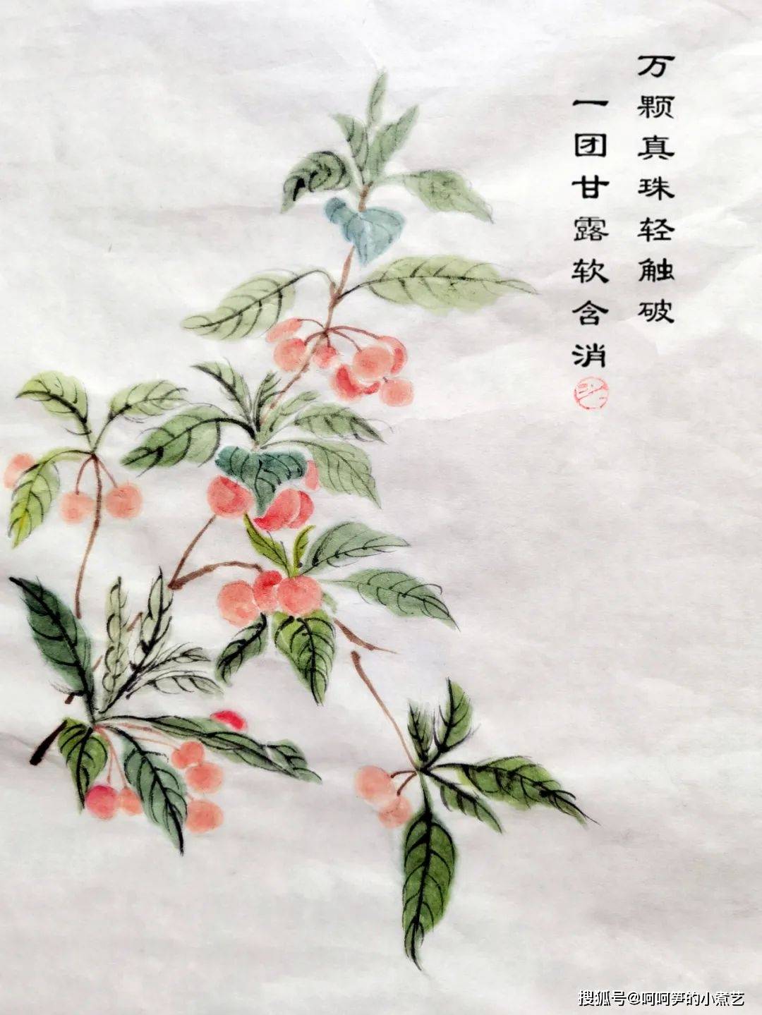 “含桃丹更圜,轻质触必碎。外看千粒珠,中藏半泓水。何人弄好手?万颗捣尘脆。印成花钿薄,染作冰澌紫。北果非不多,此味良独美。”