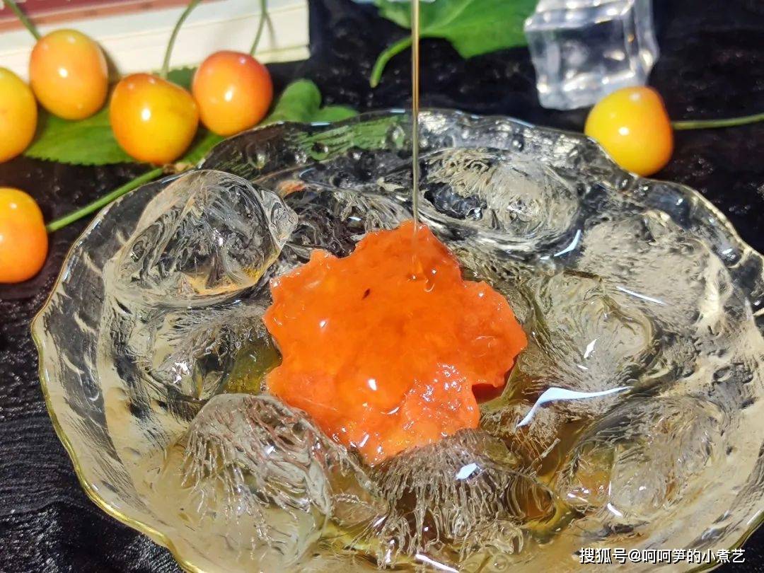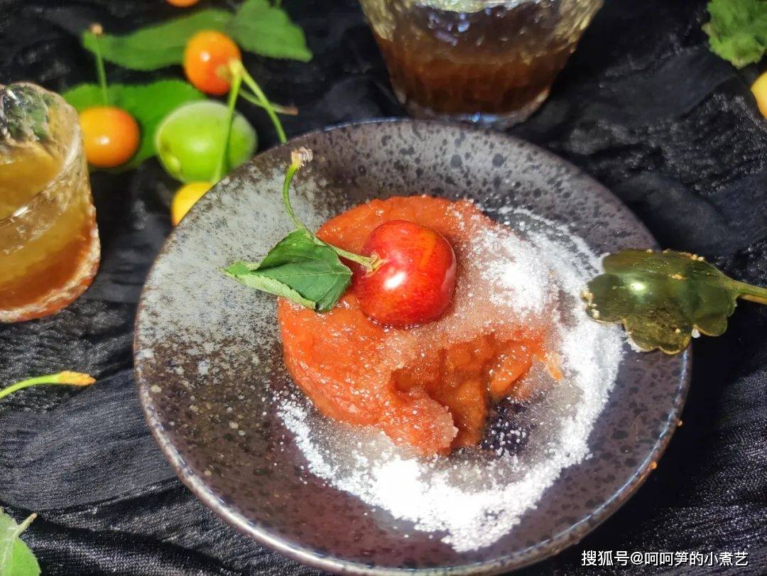 南宋的煎樱桃大多使用蜂蜜法,口感上也更软一些,蜂蜜味重一些,更通透一些。通过蜂蜜煎制后,樱桃果肉的水分几乎被蜂蜜里的糖分取代,酸度大幅降低,口感也得到升华,也适合长期存放。