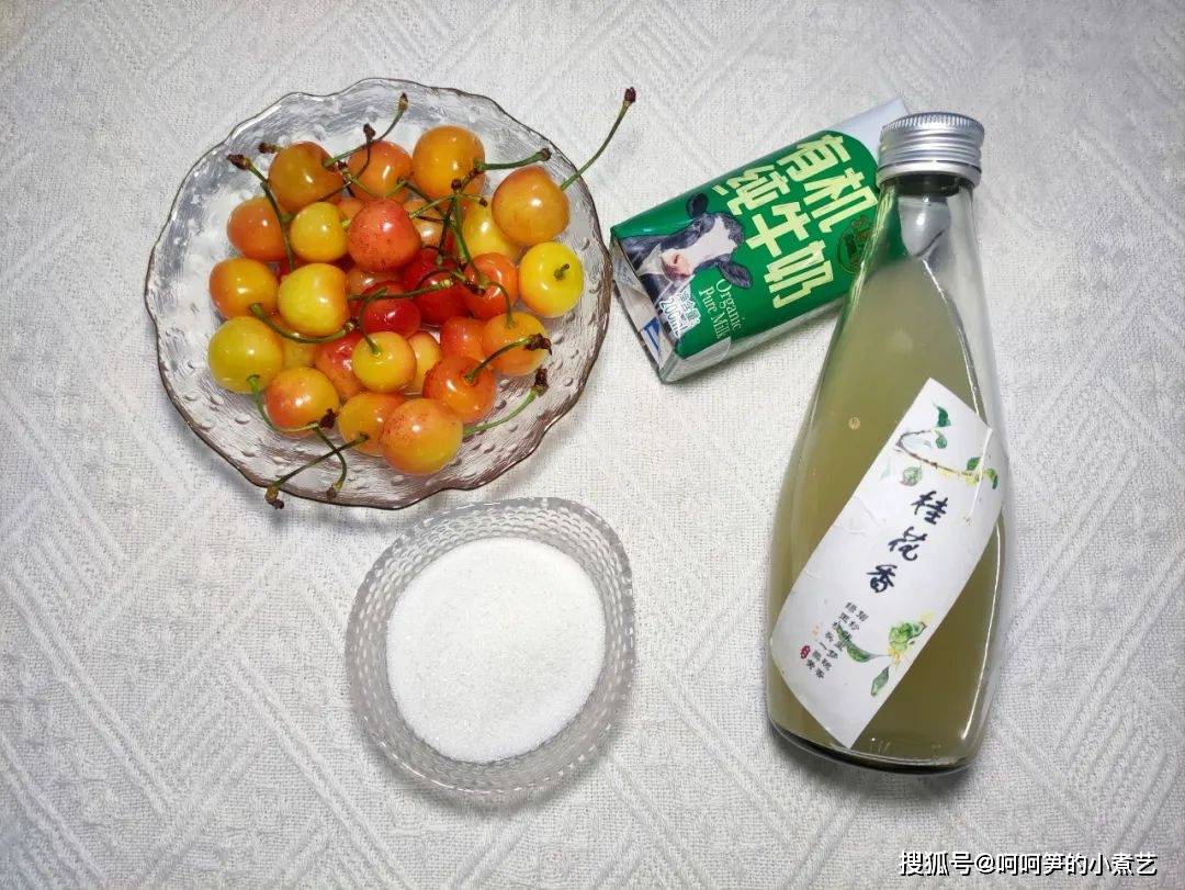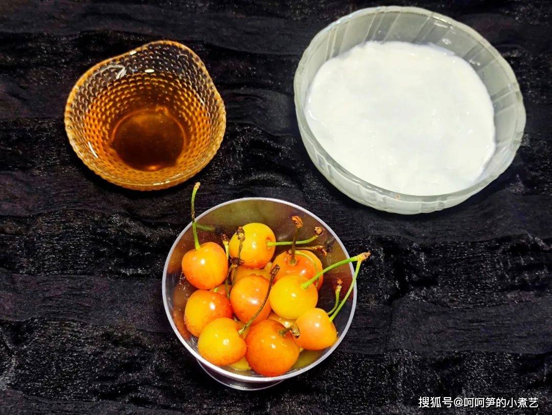 新鲜的樱桃洗净;白糖加清水熬制糖浆;一碗做好的蒸酥酪。