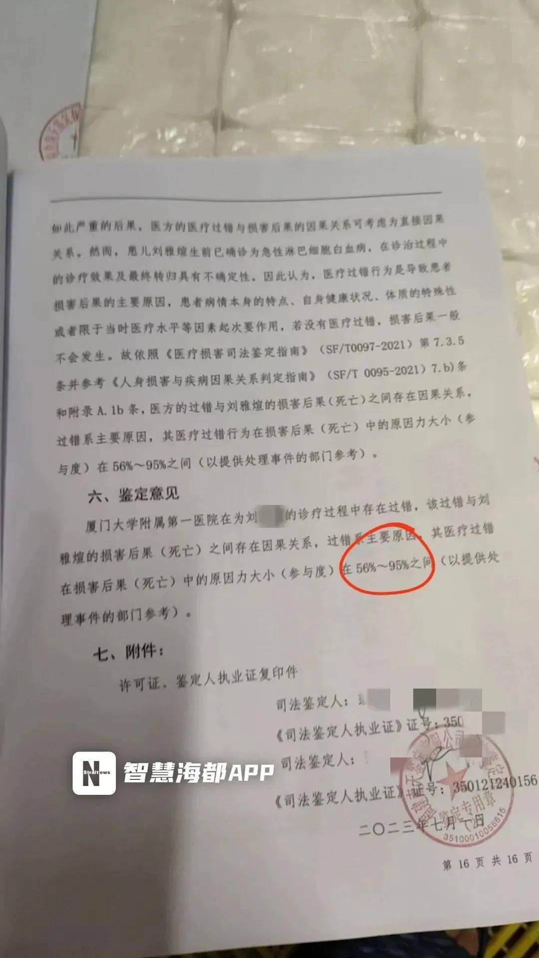 厦门大学附属第一医院在为刘某某(刘先生女儿)的诊疗过程中存在过错,该过错与刘某某的损害后果(死亡)存在因果关系,过错系主要原因,其医疗过错在损害后果(死亡)中的原因大小(参与度)在56%~95%之间。