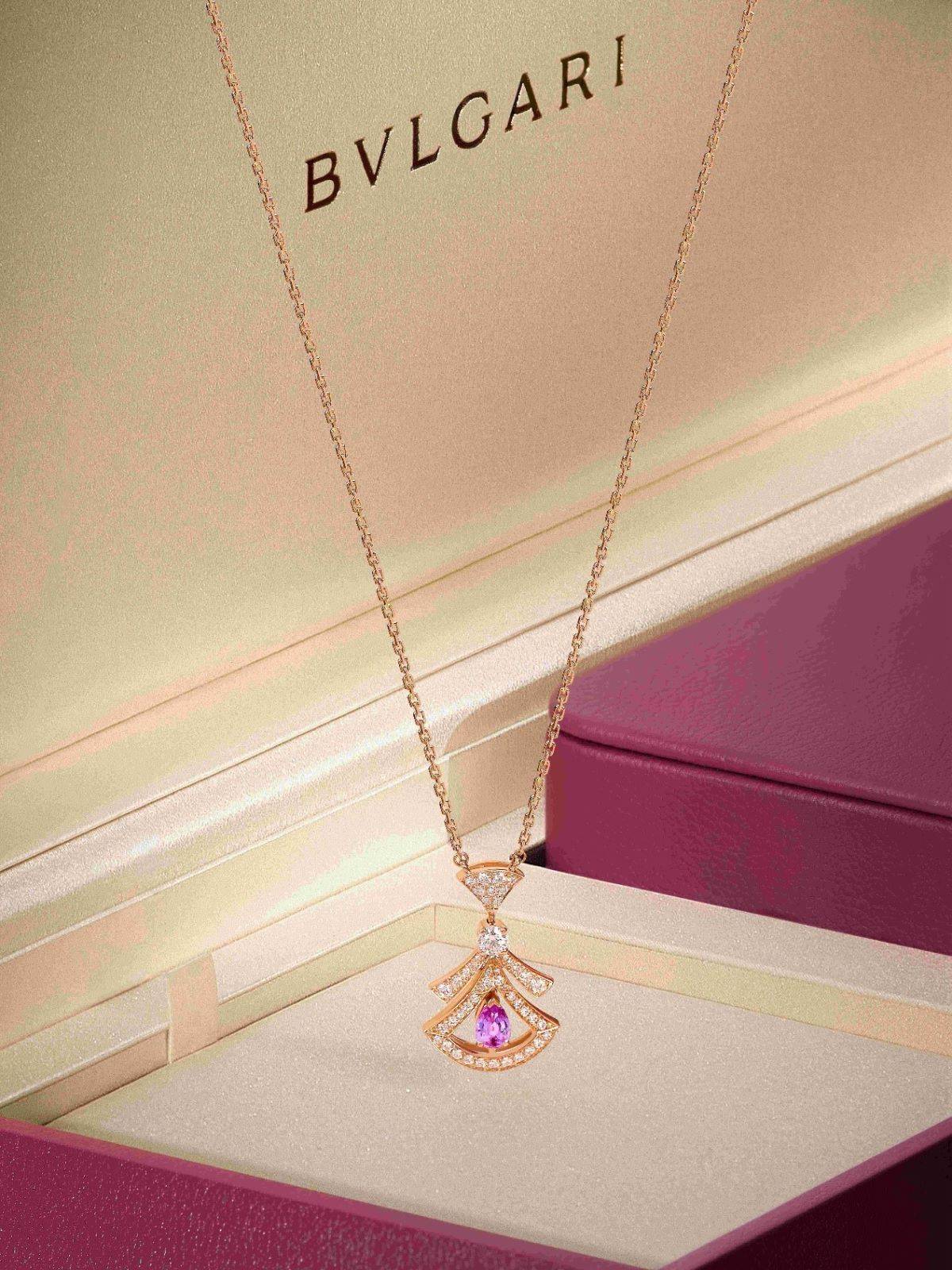 宝格丽DIVAS’ DREAM系列推出七夕情人节特别款项链,源自“永恒之城”罗马的美学灵感,,传递“LOVE BRIDGES YOU AND ME我赴爱与你”的执着信念。采用灵动的镂空结构,为标志性扇形元素注入热情洋溢的氛围,梨形粉色蓝宝石释放欢愉烂漫的光辉,将当下热烈的爱镌刻成不朽篇章。