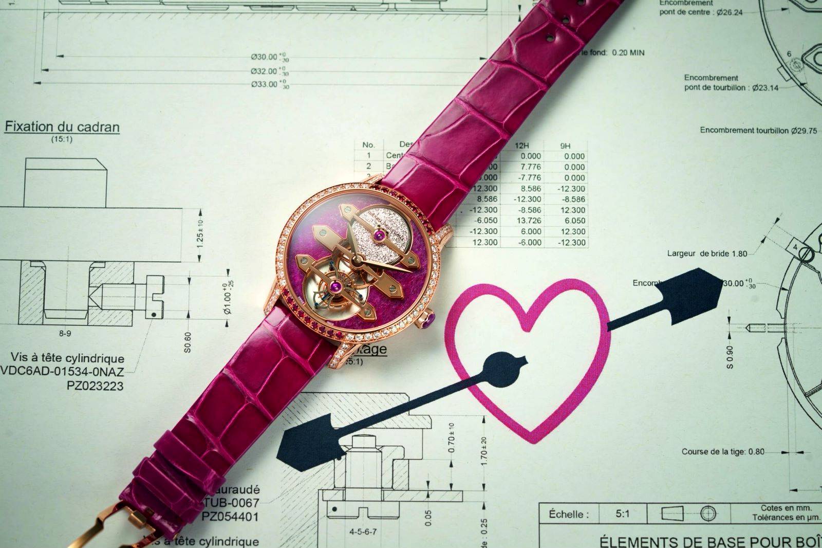 GP芝柏表三金桥陀飞轮红宝石之心腕表,设计灵感源自于品牌创始人的浪漫爱情故事,表盘以红宝石之心打造,细节丰富,鲜明衬托出三金桥的美韵。表壳采用18K玫瑰金材质,直径38毫米,并装点了大量珍贵宝石并配以精美修饰。阳光下,红宝石的光芒莹莹闪耀,宛如心中涌动的爱意,以盛放的热情讴歌人间挚爱。