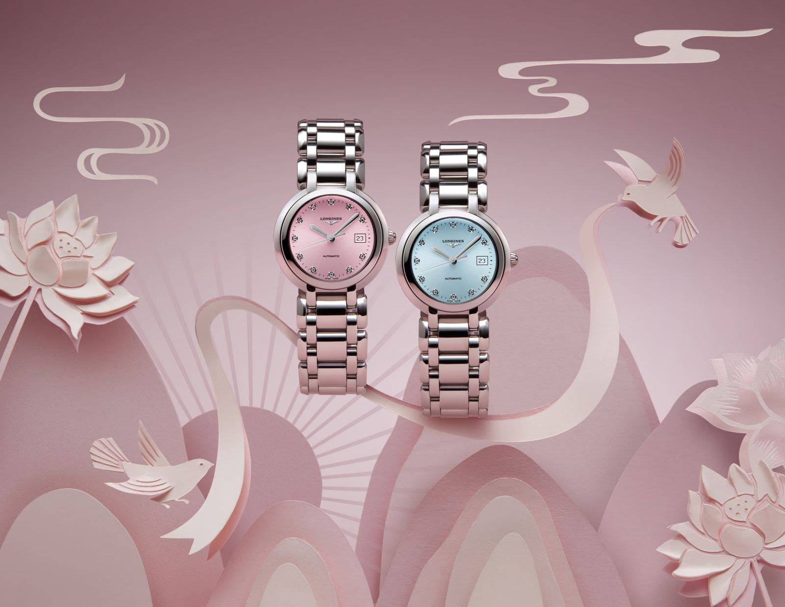 浪琴表全新心月系列表盘融入梦幻樱粉和沁爽冰蓝双重色彩,搭载L592自动上链机械机芯,表盘直径30毫米。延续心月系列的标志性元素,表盘上饰以11颗钻石时标,与镀银抛光指针相得益彰。