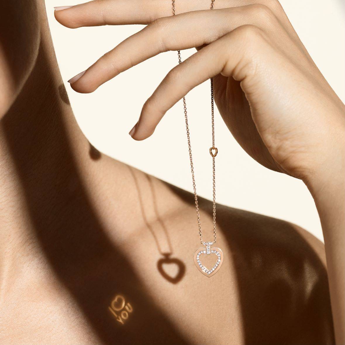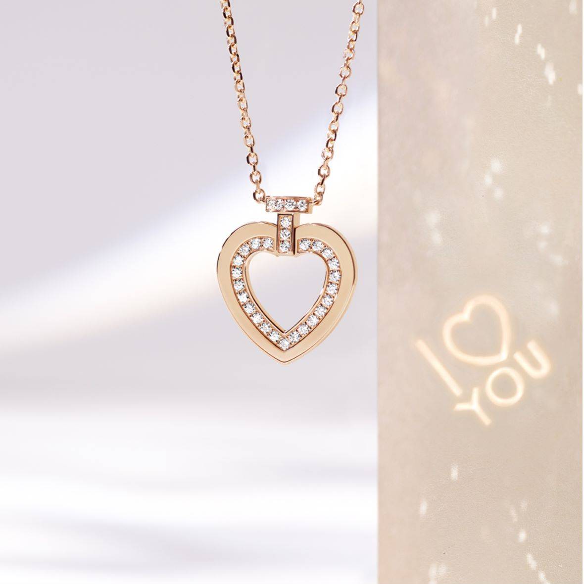 吊坠背面暗藏“I ♡ YOU” 秘语,在光线照射而至的刹那悄然点亮。字母和符号以浪漫梦幻的方式跃然显现,将饱藏爱意的珍贵话语镌刻在彼此心间。