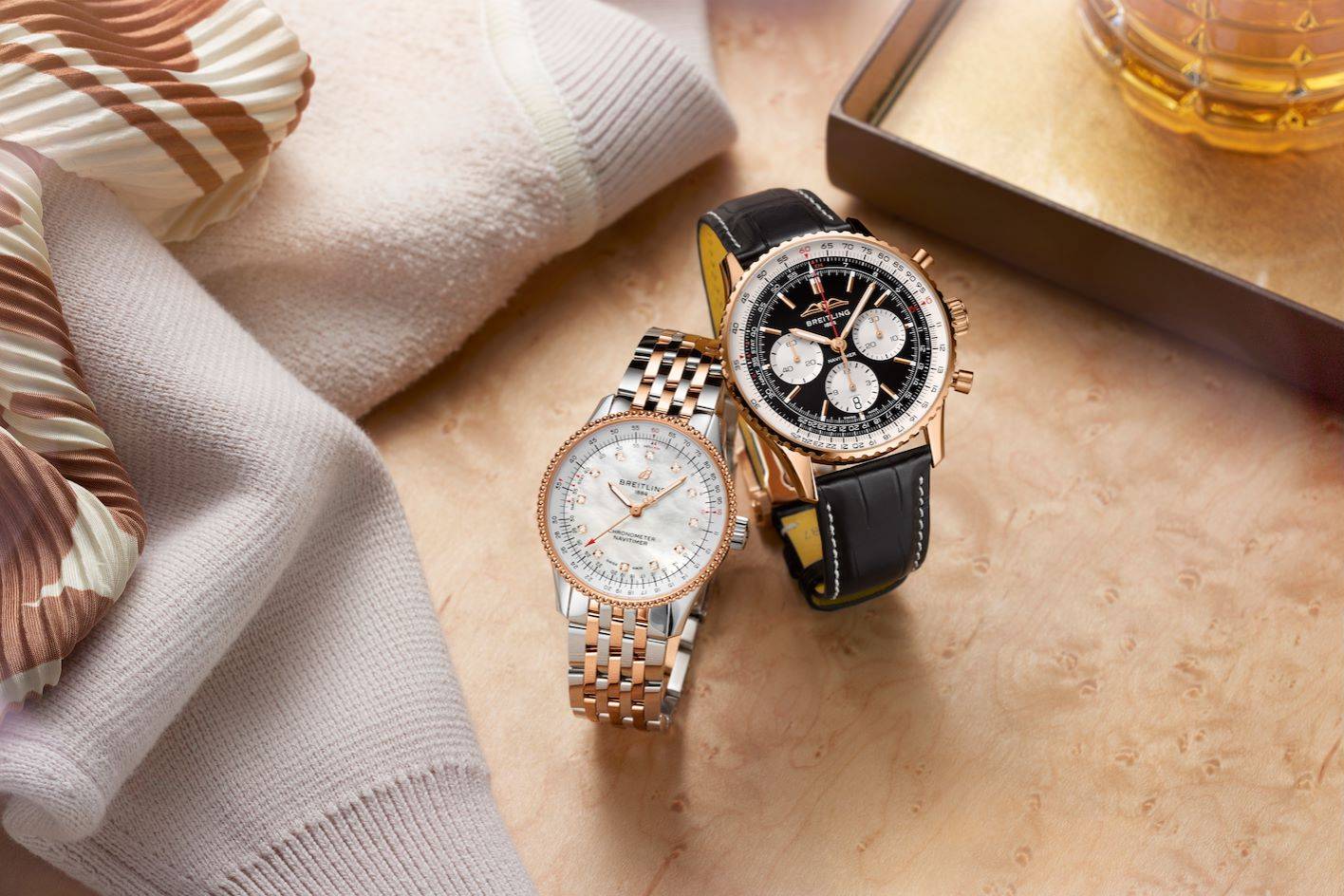 百年灵航空计时B01计时腕表43(Navitimer B01 Chronograph 43)黑白鲜明的盘面搭配标志性环形飞行滑尺,极具品牌辨识度。同系列自动机械腕表35(Navitimer Automatic 35)则配备珠宝般华丽的18K金串珠表圈,镶钻时标于纯洁的白色珍珠母贝表盘之上,与间金表链互衬出高贵典雅,亦可融入日常佩戴。