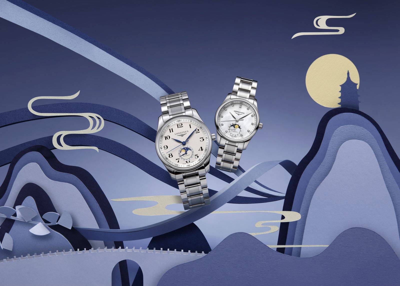 名匠系列月相女表,白色珍珠母贝表盘上镶嵌明亮钻石,散发女性柔美优雅气质;名匠系列月相男表,麦粒纹表盘与蓝钢指针相得益彰,展现成熟刚毅的绅士格调。表盘6时位置设有浪漫的月相显示窗,见证亘古不变的爱意。