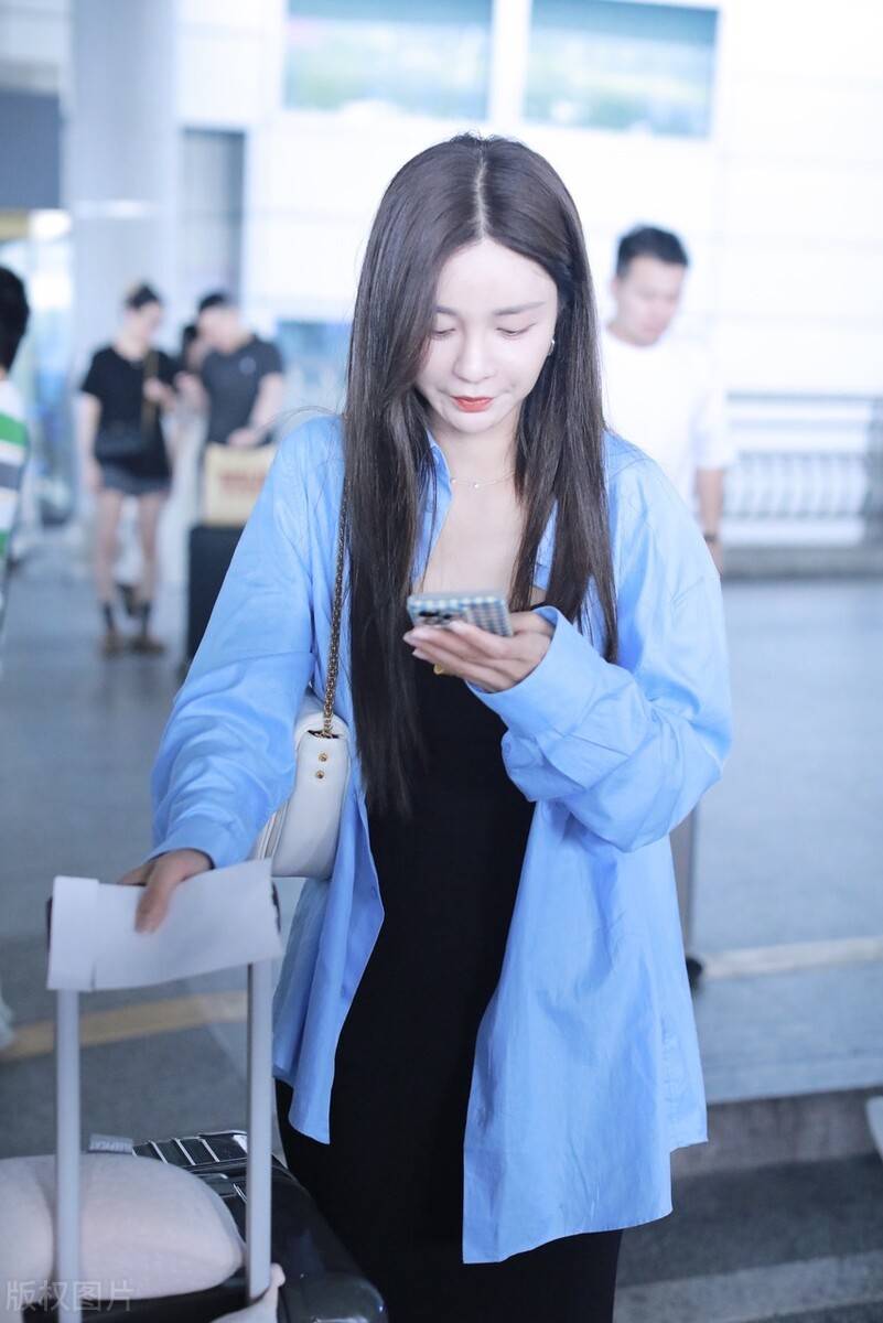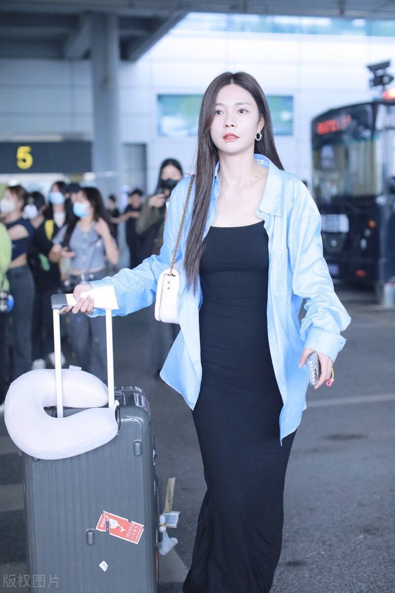 这段时间,沈梦辰的机场造型都很出圈呀,她的时尚品味也是越来越高级了。只见她穿一条修身的黑色长裙,搭配了浅蓝色的宽松衬衫。一半清爽帅气、一半优雅妩媚,真是风情万种好迷人。