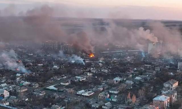 (巴赫穆特也已被炮击变得和废墟差不多了)