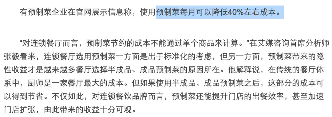 有数据指出,使用预制菜,能让餐厅的成本下降40%左右