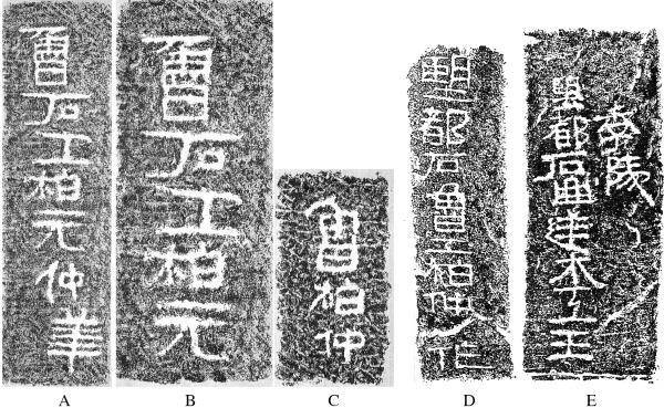 石匠的刻名。东汉,约公元84年-93年。纸墨拓片。大小不一,此处并非按原比例复制。 (a)“鲁石工柏元仲华”,图片引自山东省济宁市文物局编:《汉任城王墓刻石精选》,118页。