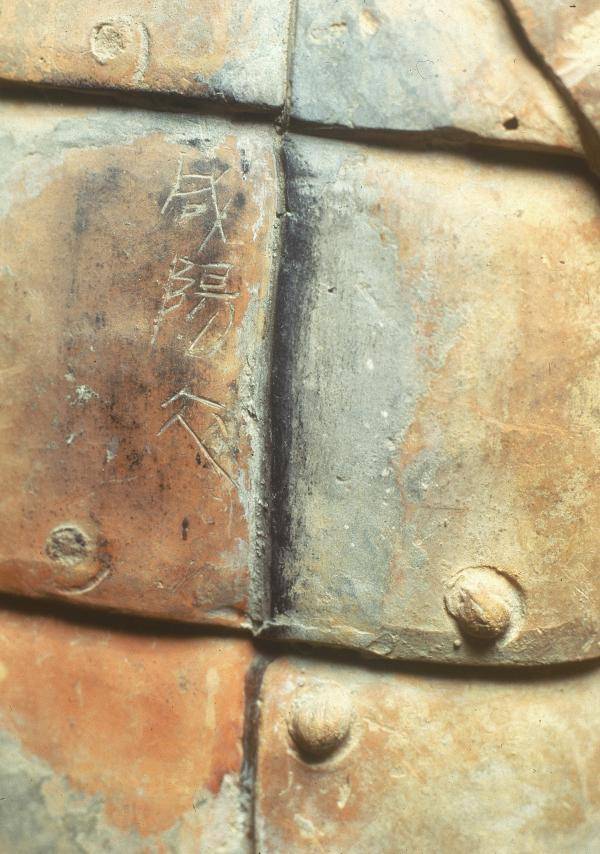 咸阳衣(工头名字),刻于陶俑。秦代。秦始皇兵马俑博物馆。图片引自袁仲一:《秦始皇兵马俑博物馆》,文物出版社,1999年, 图版207