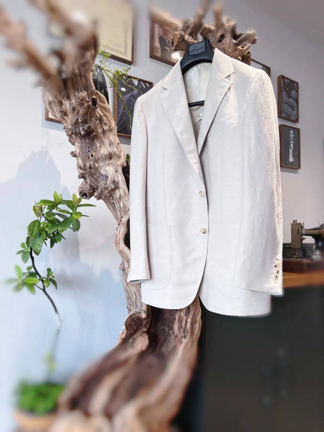 西装采用意大利纯麻面料,船形袋和贴袋的设计,有种看似漫不经心的松弛老钱风。意式修身立体剪裁,无垫肩的轻薄设计,穿起来舒适度很高,配合那不勒斯全麻衬工艺,在夏日的海边也能凉爽透气。
