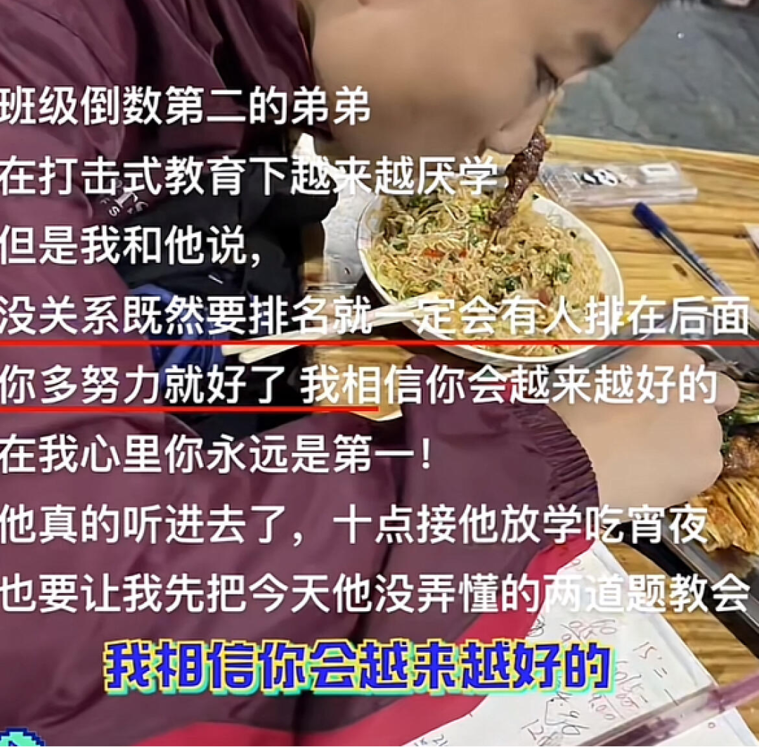 前段时间刷到另一个视频,是考班级倒数第二的弟弟在打压式教育下越来越厌学,姐姐就对他说: