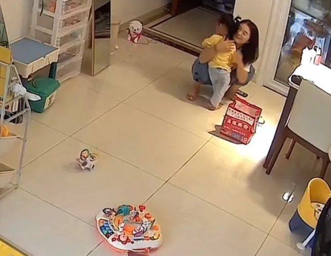 妈妈看到地上打翻的饭,刚开始询问情况,孩子怕妈妈责怪,抱住妈妈的大腿,奶声奶气地哼哼: