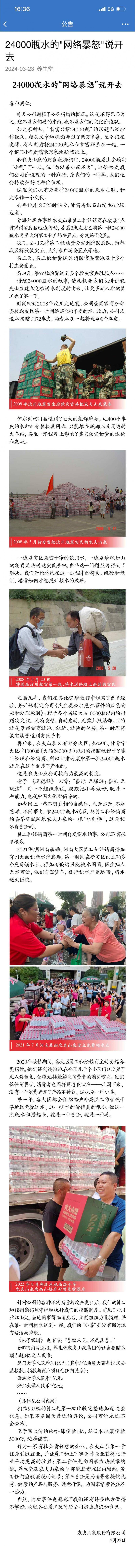 3月23日,农夫山泉以内部信的形式回应了“首富只捐24000瓶”的言论,解释称公司在去年甘肃地震中捐赠的24000瓶水只是第一批物资,后续还有多批物资送达。