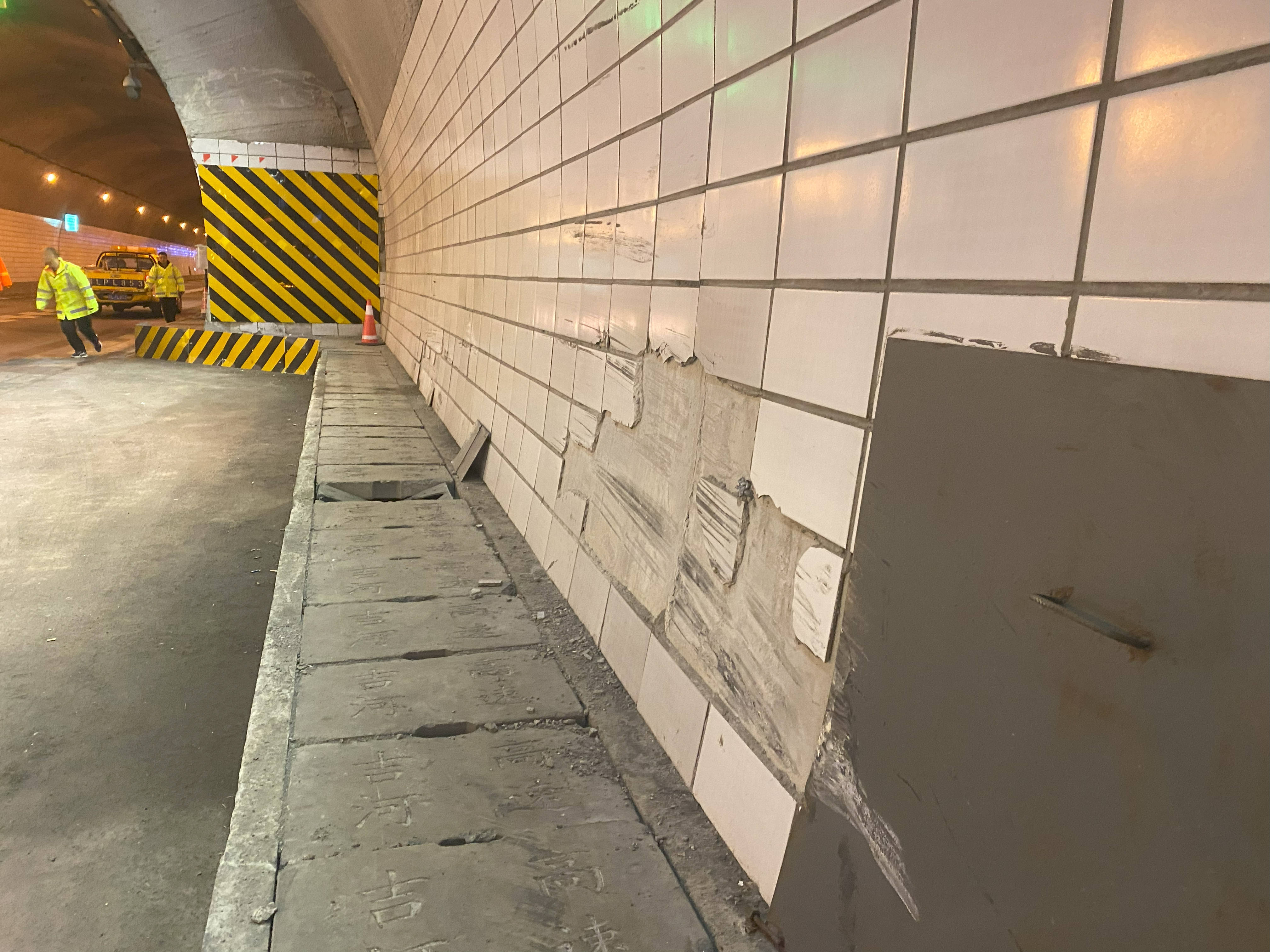 西家塔隧道中段,被撞墙壁有明显剐蹭痕迹。 澎湃新闻记者 陈灿杰 图