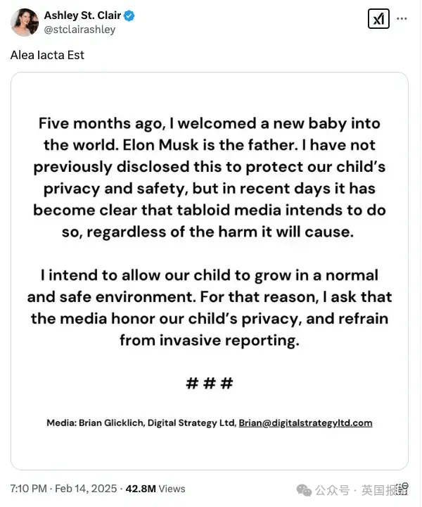 "五个月前我迎来新生命,孩子的父亲正是马斯克。”