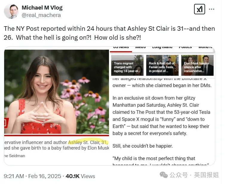 情人节那天晚上,一个百万粉丝的MAGA网红阿什莉·圣·克莱尔,忽然在推特上曝光了一个消息:她在五个月前给马斯克生了一个孩子。