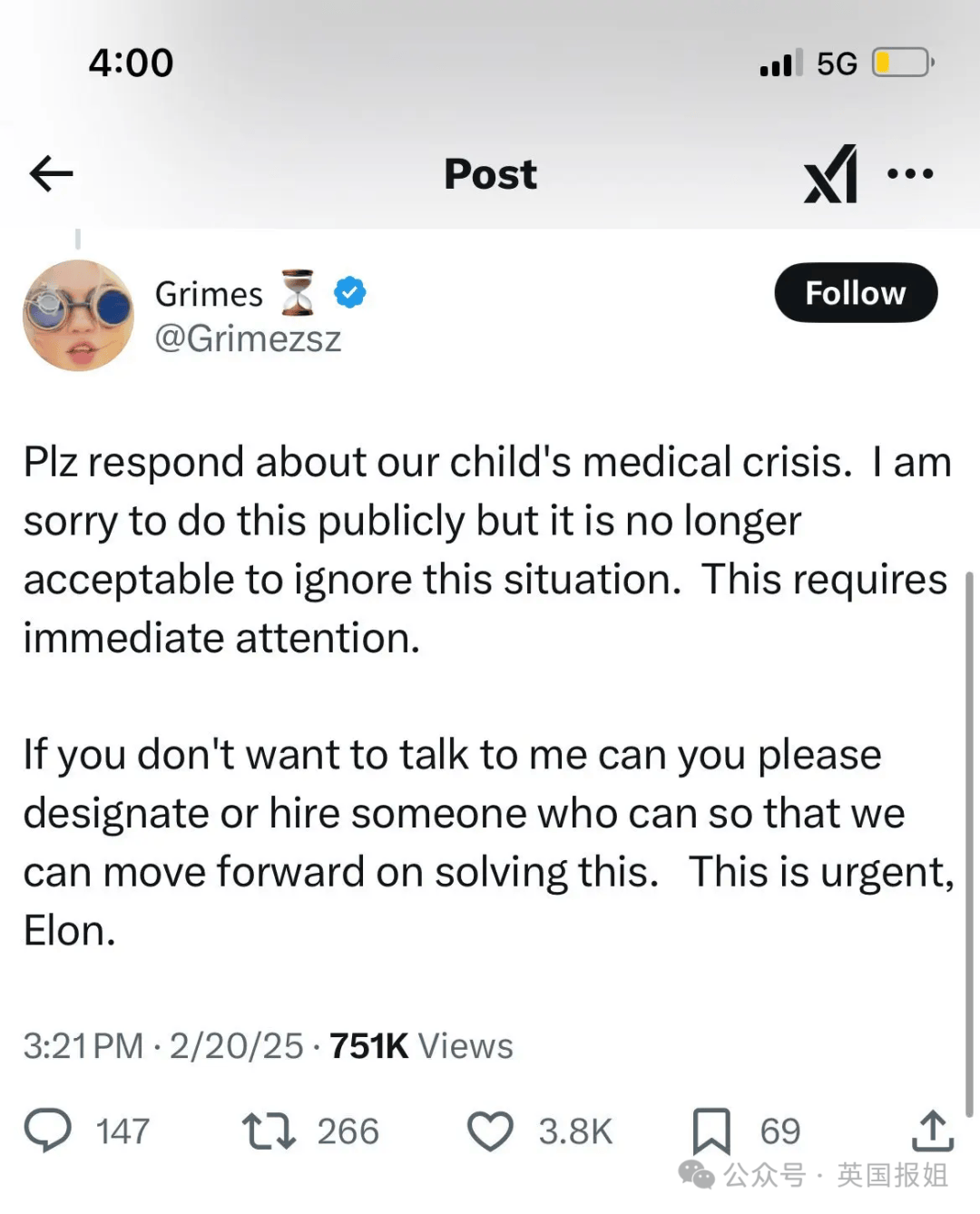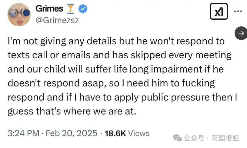 就在本周早些时候,马斯克另外一个孩子妈,他的前女友加拿大歌手格莱姆斯,也就是X Æ A-Xii、Exa Dark Sideræ l和Techno Mechanicus的妈,通过推特公开喊话马斯克:“请对我们孩子的医疗危机作出回应”。